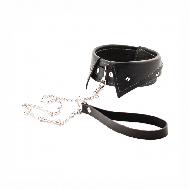 Черный ошейник выполнен из натуральной, мягкой кожи высокого качества и имеет форму воротника, в дополнение  оснащен металлическим поводком для управления партнером